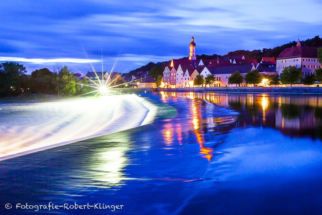 Foto vom Lechwehr und der Altstadt von Landsberg am Lech